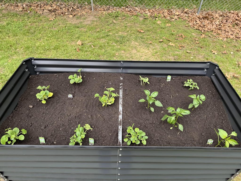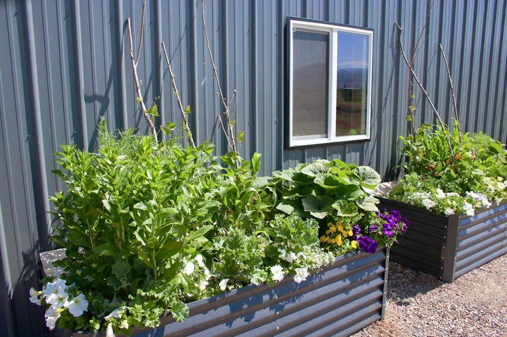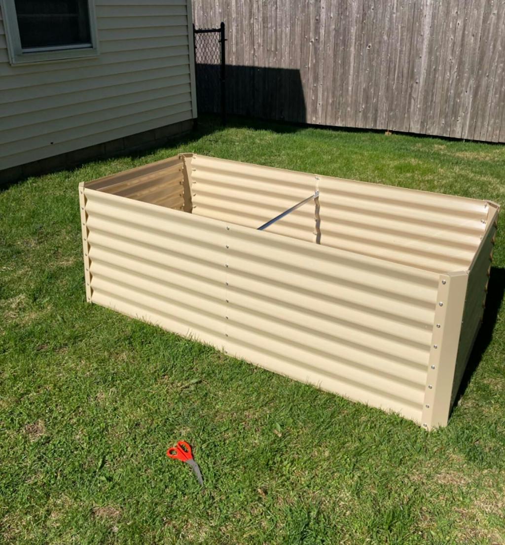 The corrugated steel panels are reinforced with internal bracing and sturdy corner protectors, ensuring the bed maintains its shape even when filled with heavy soil.