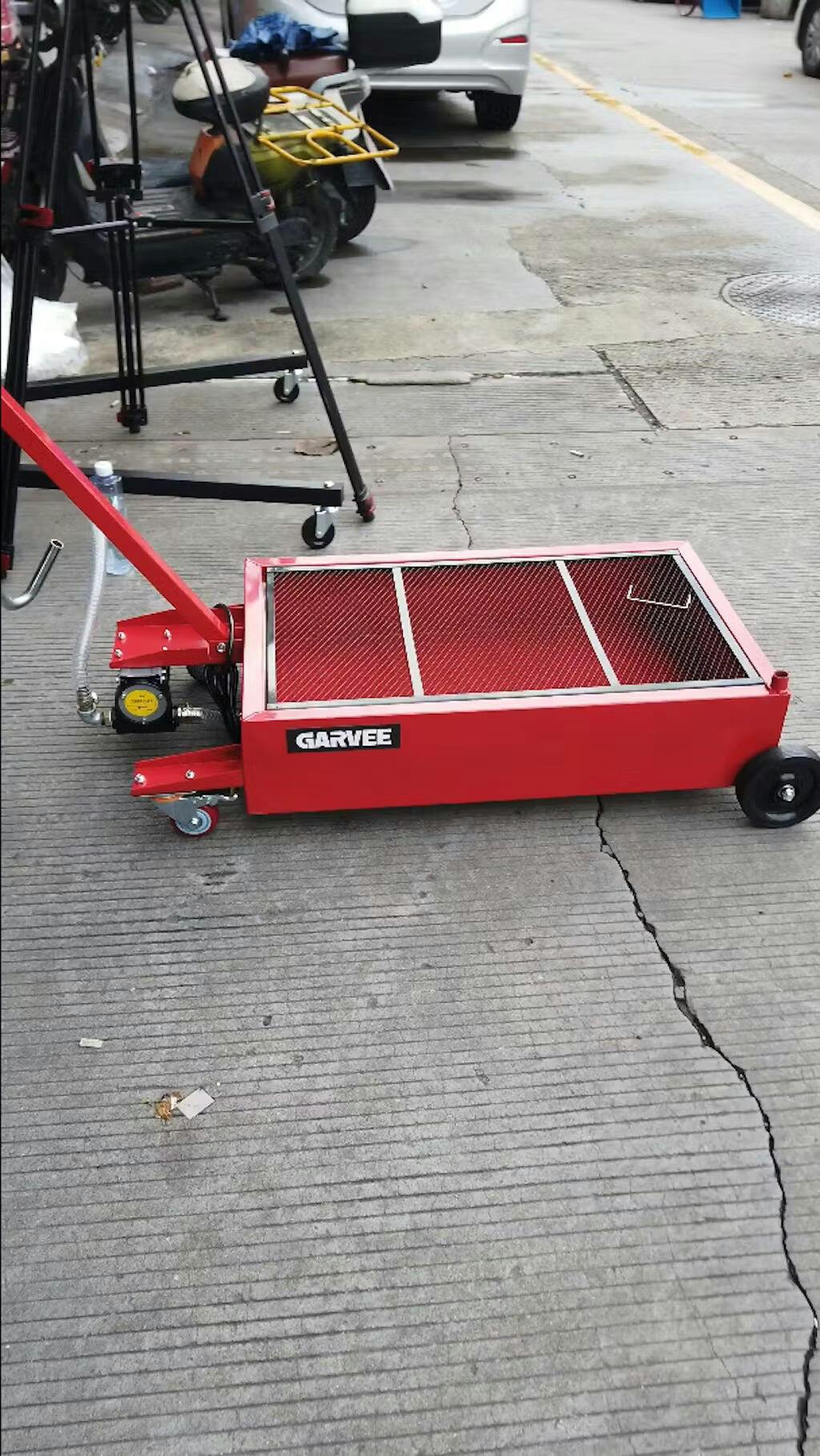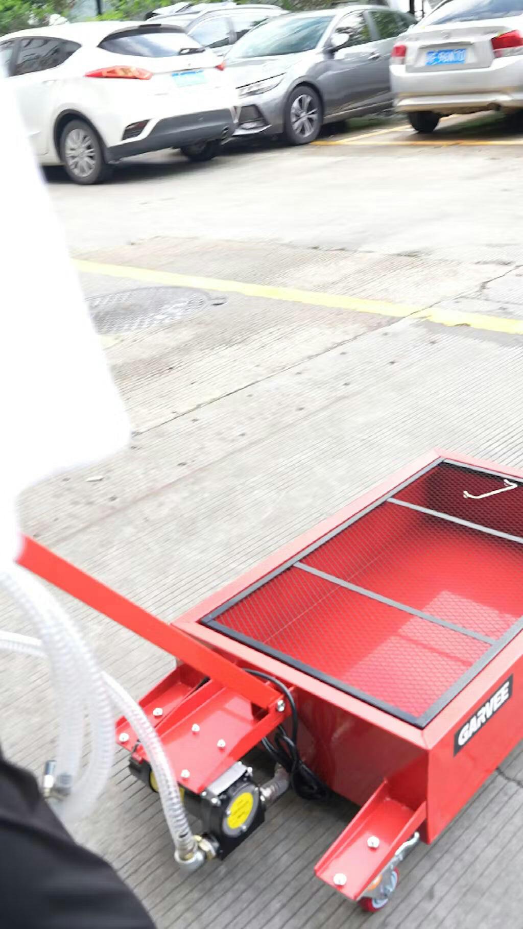 This low-profile oil drain pan is designed for easy positioning under cars and vans, offering smooth fluid collection and controlled transfer through a hand-pump and hose system. Ideal for both home garages and professional workshops.