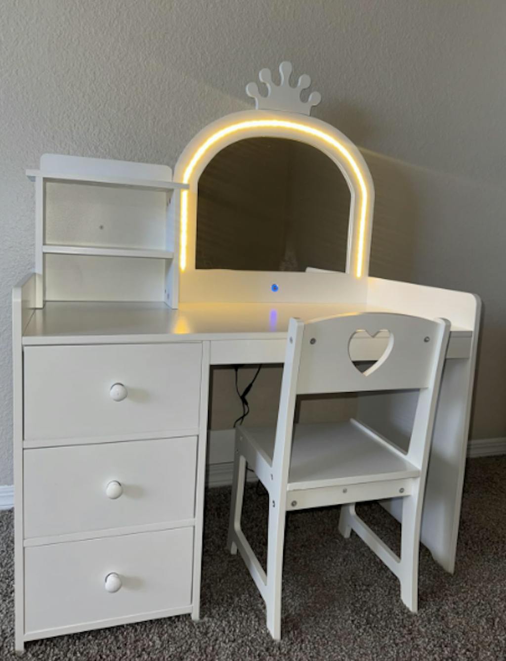 Magical Princess Experience: Let your child feel like royalty every day! The vanity table set has a crown-shaped mirror with touch-activated three-color LED lights, giving your little girl a glamorous space for imaginative play or daily dress-up routines