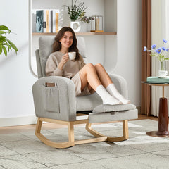 Garvee Rocking Chair Nursery Nursing Rocker with Foot Rest High Backrest Solid Wood Base Upholstered Lounge Chair for Living Room Bedroom Beige